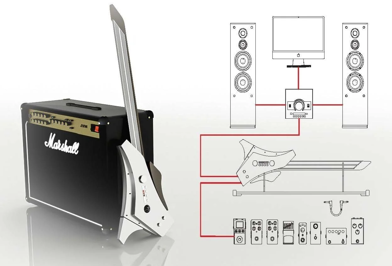 For materiality I wanted to highlight a more vintage aesthetic with burshed aluminum and hardwood handles. Placing the AX-101 on a pedestal gives more quality to the guitar as well as a guaranteed safe spot to store the instrument.