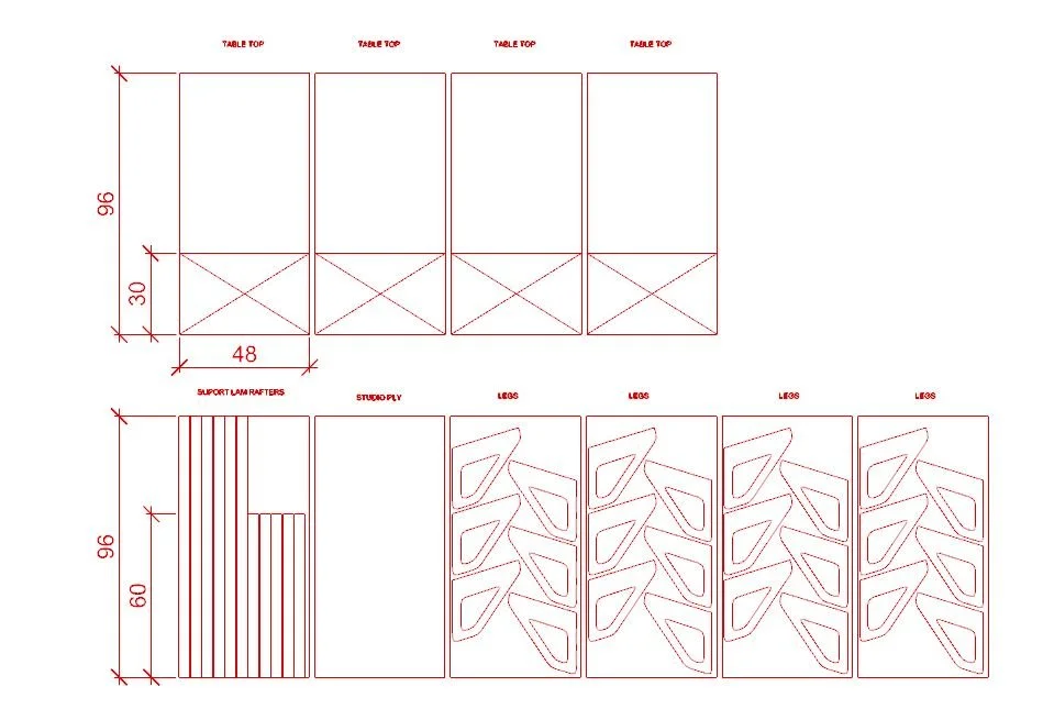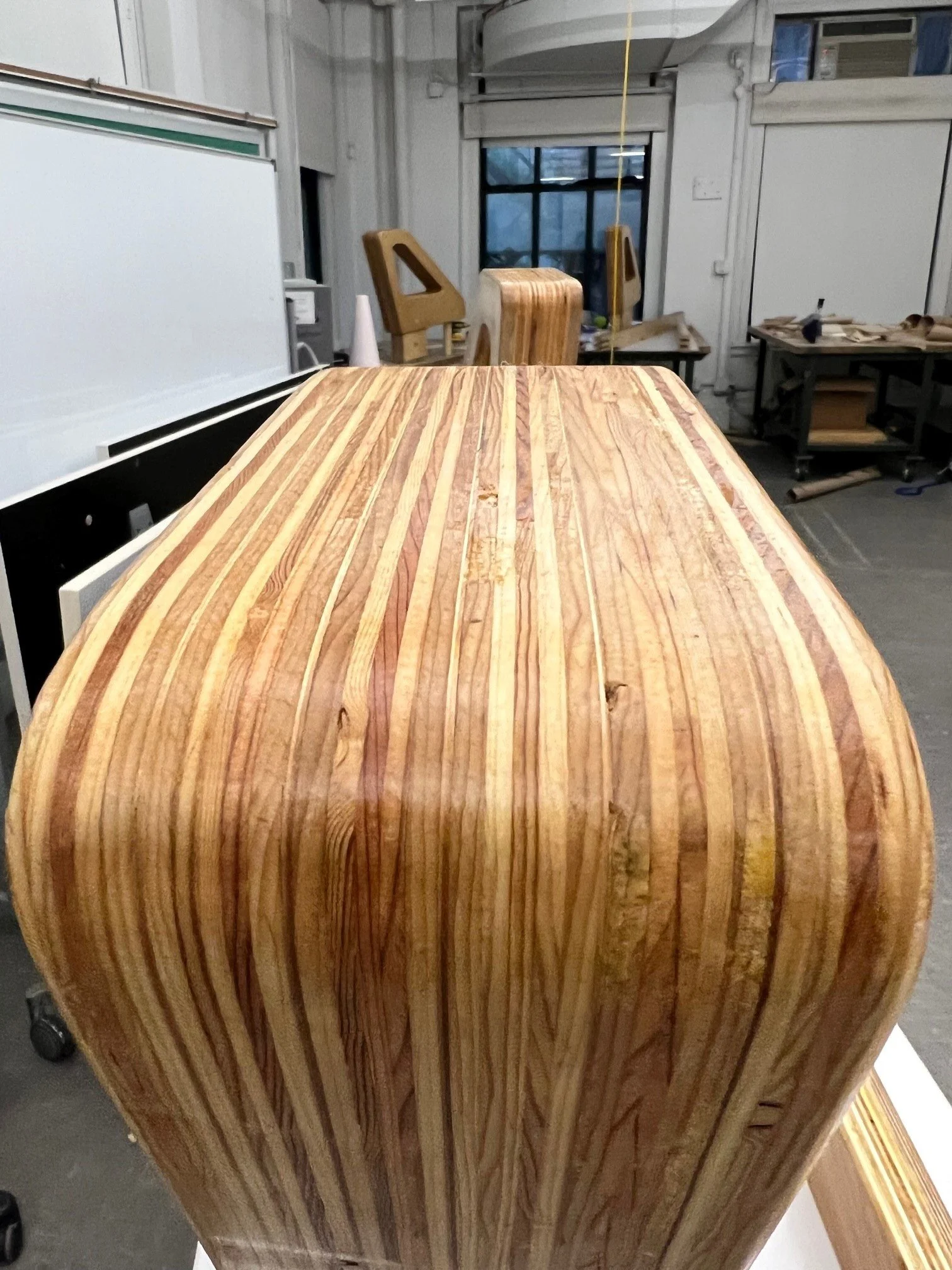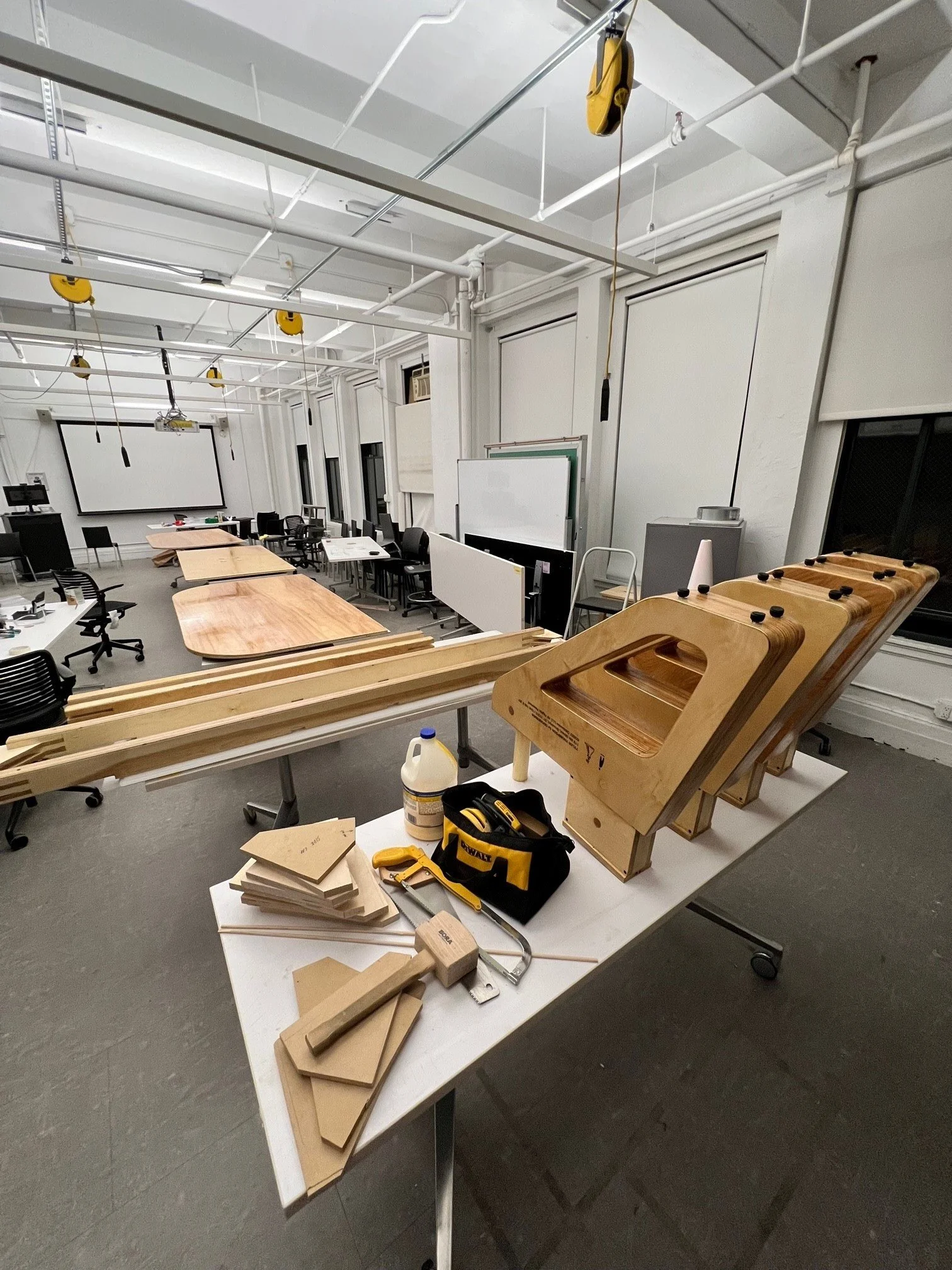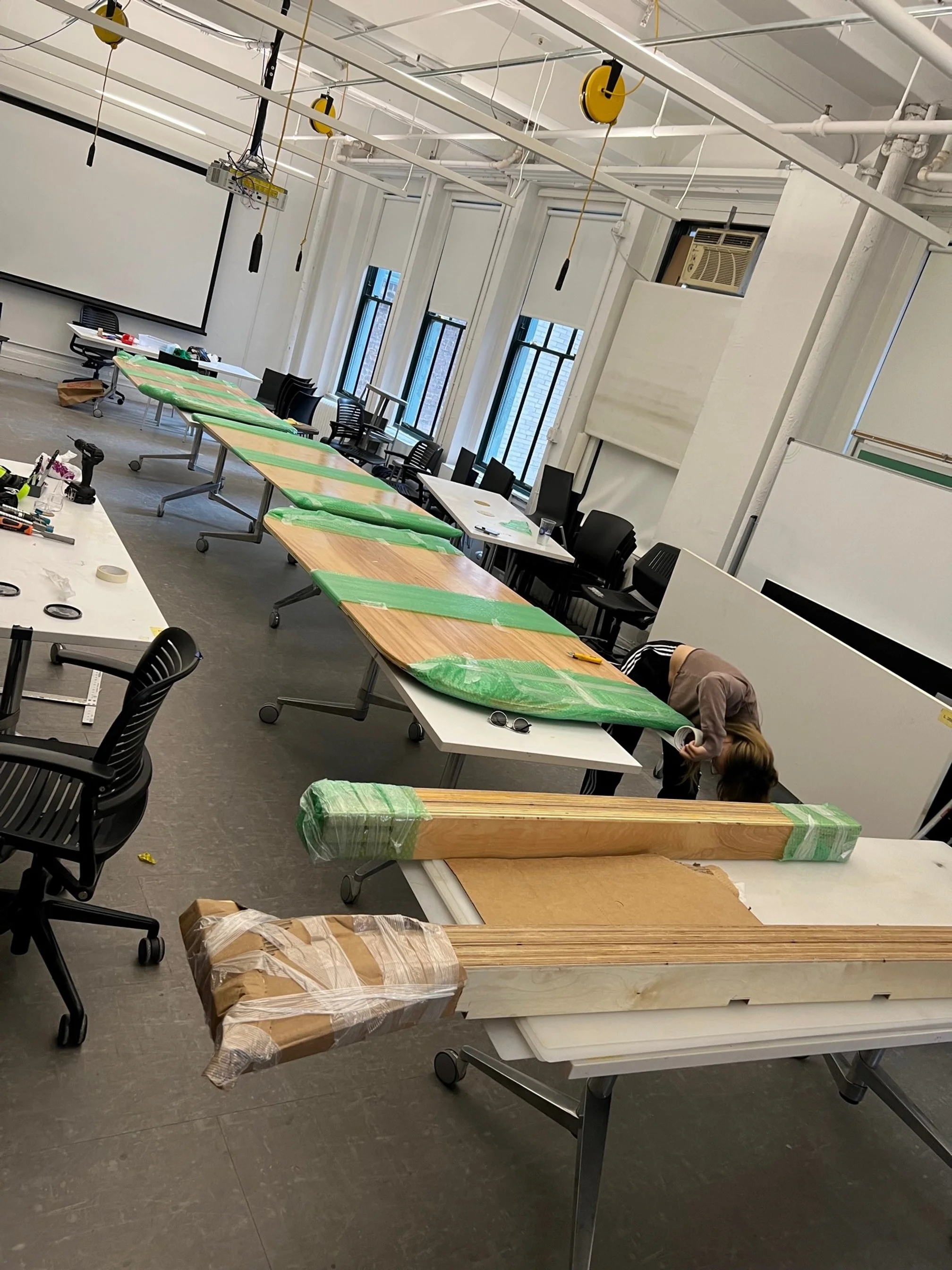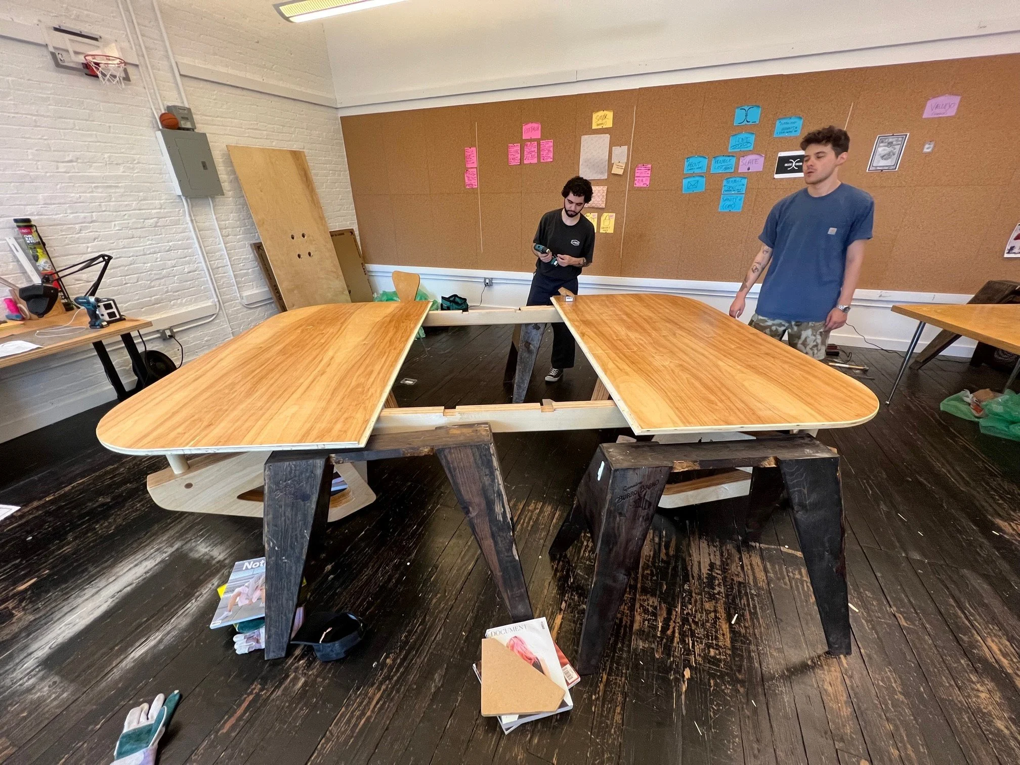 As a freelance designer, I took on the challenge of creating a custom conference room table for Oddsense Studios in Brooklyn, NY. With a limited budget of $1000, I transformed a private space at my school into a temporary studio for designing, building, finishing, and packaging the table for delivery. The table had to be designed for on-site installation, allowing it to be transported in pieces through a specific door at the office. The thoughtful design of the table focused on accommodating computers and providing a meeting space that fosters inclusivity. Large rounded corners replaced sharp edges, ensuring that users could sit comfortably at the corners and feel involved in conversations during meetings. To achieve both aesthetics and structural integrity, the legs were positioned at angles, creating a spaceframe-like architecture. Dowels were strategically placed as outer edge supports, giving the table a floating appearance above the legs.