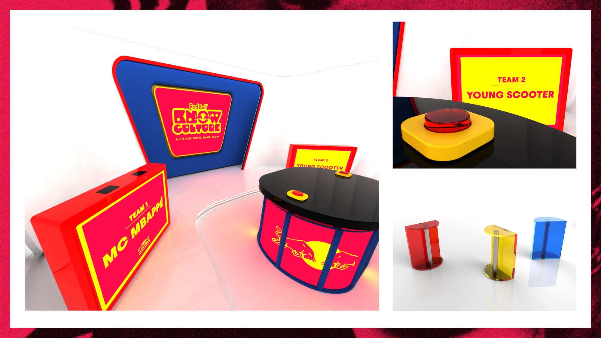 As a freelancer collaborating with Oddsense Studios in Brooklyn, NY, I had the thrilling opportunity to work on a special hip-hop trivia gameshow for Redbull. Our main goal was to create a lively and entertaining atmosphere, prioritizing fun over deep hip-hop knowledge. The gameshow was designed to bring out the contestants' light-hearted and life-loving sides while showcasing their rap skills in an engaging competition. Working closely with the Oddsense Studios team, we carefully designed the stage with a central entrance for contestants, giving it a WWE wrestling show-inspired grand entrance.